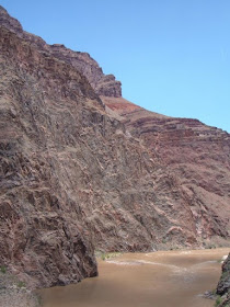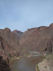 Once again our group set out second, trailing substantially behind the other set of eight overnight mule riders. Their group, for some reason, made much better time both in and out of the canyon. I overheard our guides discussing this fact, and apparently the other group's cowboy was known for setting a grueling pace. I was kind of thankful to be in the slow group personally. The only real problem we had was that last night Danielle realized that the extra memory she brought was not compatible with her digital camera. We were now working with limited resources, and were going to have to try to buy something at the gift shop when we got back out. No biggie, or so we thought. We rode out along Bright Angel Creek and eventually met back up with the Colorado, then walked along its banks until we had to cross the bridge again (the photo shown here was taken while walking along the bridge...as you can see, it's pretty high above the water). The trip afforded us more opportunities to stop (perhaps to rest the mules) and we had more chances to ask our guides questions. Our group was a rarity in that we had two guides, Mike and Mick, instead of the standard one, because Mick was in training. We learned all about the geology of the Grand Canyon (Mike was a self-proclaimed geology nut), and heard some interesting things about the wildlife in the area. We even got to see some California Condors for the second day in a row, which I'm told by the biologist in the household was quite a rare treat.