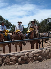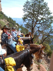 So away we went. It had been explained to me several times that the mules were in fact trained to walk as close to the edge as absolutely possible. No amount of explaining can really prepare you for it, though. The claim made by our guide was that this was done for the safety of the pedestrian hikers. Imagine, he said, if the mules tried to go inside the hikers instead of always walking closer to the edge. How long would it be before somebody fell over the edge? Truth be told I think the mules just liked to screw with us. Also, whenever we stopped along the trail, which wasn't often on the way down, the mules all pointed themselves out over the canyon. Again we were assured this was for safety, as apparently if a mule spooks he always takes his first step backwards, and again, I wasn't so sure.