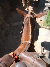 After leaving Indian Gardens, I had my second real problem aboard Dan, as I failed to make it through a "fireplug." Throughout the two days our guide would periodically yell out "Fireplug!", which was our cue to motivate our mules and keep them moving. These places along the trail were spots where, for one reason or another, the mules liked to stop to take a leak. Now mules relieving themselves isn't something you can really put a stop to, but it is something you'd rather not have happen all at once. Just one of these guys stopping for a pee break ends up leaving quite a mucky mess on the trail; a few of them deciding to do it all at once and you get the sense a mudslide couldn't be far behind. Well anyway on the way up the fireplug call was made and the mule in front of me stopped and then started up again but it was too late; Dan let it fly, along with now both of the mules behind him. Alas.